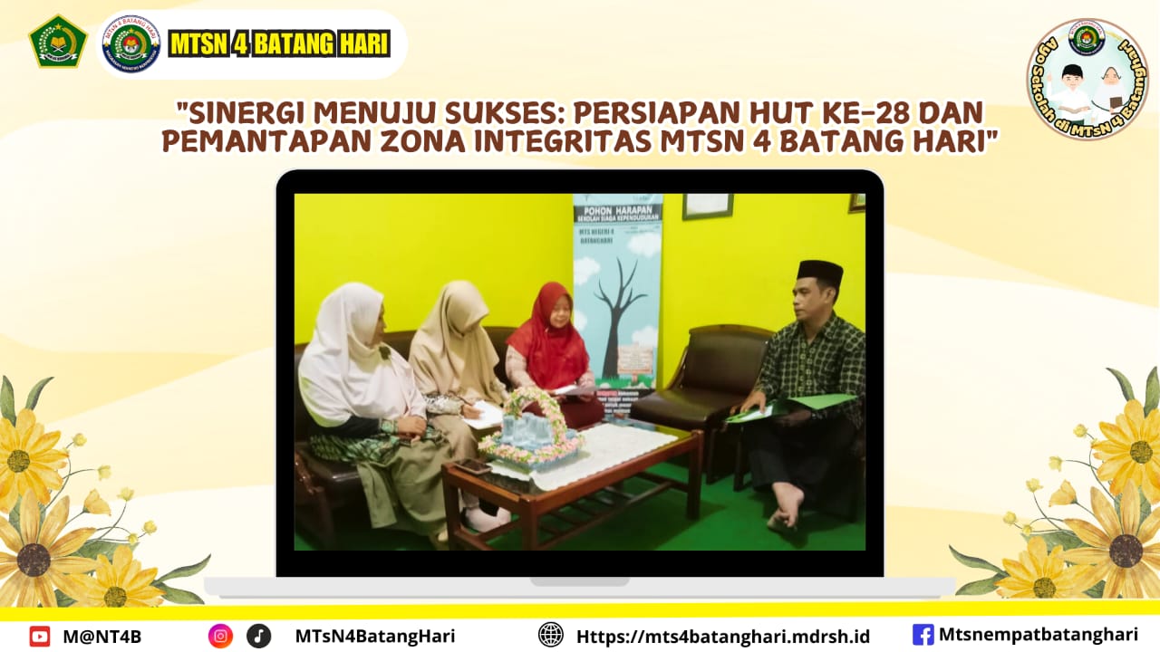 Batang Hari, 23 Januari 2025 – Dalam rangka memperingati Hari Ulang Tahun (HUT) MTsN 4 Batang Hari yang ke-28 serta memperkuat komitmen menuju Zona Integritas (ZI), Tim Pengembang Madrasah mengadakan rapat penting di ruang kerja Kepala Madrasah, Rabu (23/01). Rapat tersebut dihadiri oleh Kepala MTsN 4 Batang Hari, Bapak M. Husni Thamrin, S.Ag., M.S.I, Ketua Tim Pengembang Madrasah, Ibu Rumini, S.Pd., bersama anggota tim lainnya yaitu Ibu Sabariyah, S.Ag., dan Ibu Destia Rizki, S.E.